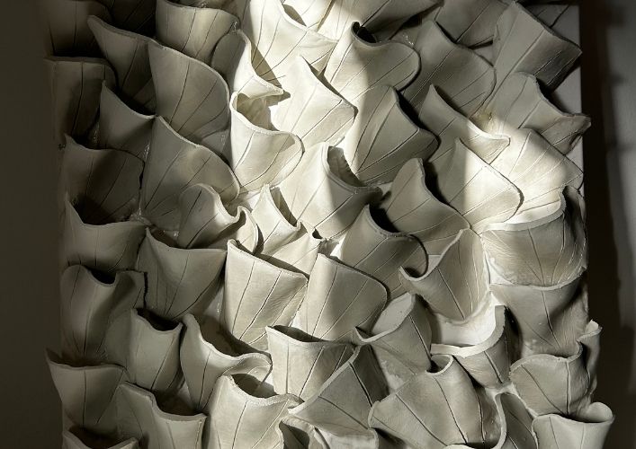 We are delighted to present ‘Empremtes del Mediterrani,’ the new exhibition by artist Camile. Art by Natalia at Palau Fugit. Through an intimate perspective, her creations capture the fleeting beauty of Mediterranean nature. The white of plaster becomes both canvas and substance, a space where light and shadow sketch silence. Inspired by the flora and landscapes of our surroundings, the artist invites us to contemplate and pause through a collection that blends painting and jewelry, textures and organic forms, memory and touch.